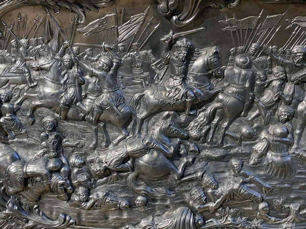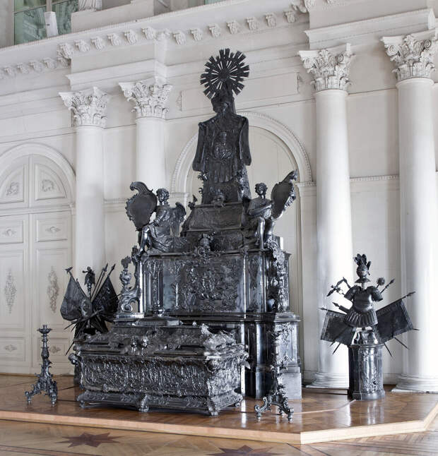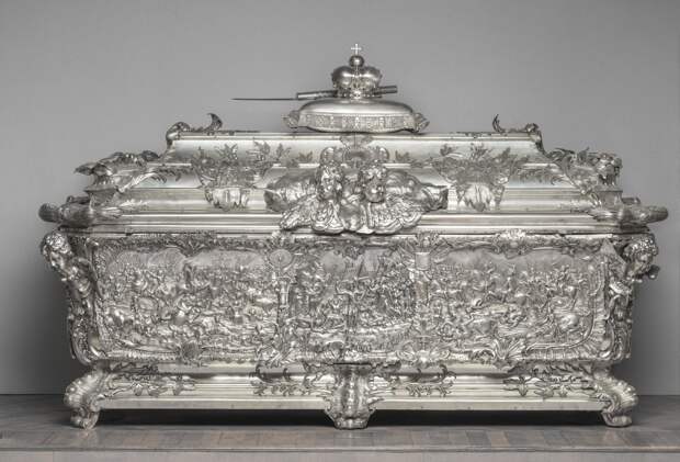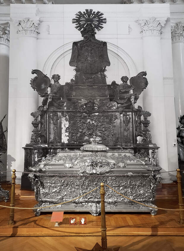 История саркофага грандиозна и фантастична. Александр Невский, новгородский князь XIII века, был ключевой фигурой в истории России. Ему присвоен легендарный статус из-за его побед над немецкими и шведскими захватчиками. А в 1549 году он был причислен к лику святых Русской православной церковью, и Петру I пришла в голову идея сделать его святым покровителем Санкт-Петербурга. Он заказал строительство Александро-Невской лавры, куда в 1724 году и перенесли доставленные из Владимира мощи святого. Затем дочь Петра императрица Елизавета заказала для них серебряный саркофаг в форме пирамиды, крупнейший в мире серебряный памятник.