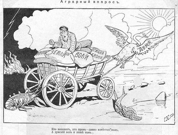 Витте думал, что после принятия манифеста он сразу же договорится с либералами – а ничего подобного не произошло. Он предложил либералам войти в правительство – они отказались. Они сказали: «Вы должны организовать выборы в Думу, а после того, как будут избраны депутаты, вы передадите всю власть Государственной Думе. И уже Государственная Дума решит, какую конституцию для России написать, отдать ли крестьянам землю и т. д. Дума проведет уже все необходимые реформы, а вы нам не нужны. Старый порядок должен уйти после того, как состоятся выборы в Думу». И когда Первая Дума была избрана, победу там одержали кадеты, то есть радикальные либералы, которые мечтали превратить Думу в таран против царской власти. И именно потому власть была вынуждена Думу распустить. Поменялось правительство, министром внутренних дел стал Столыпин, премьер-министром – Горемыкин; они и пришли к тому, что – ничего не поделаешь – такую Думу надо распускать.Политическая карикатура по басне И. А. Крылова «Лебедь, рак и щука» («Искры», 1906, № 23, С. 274.)