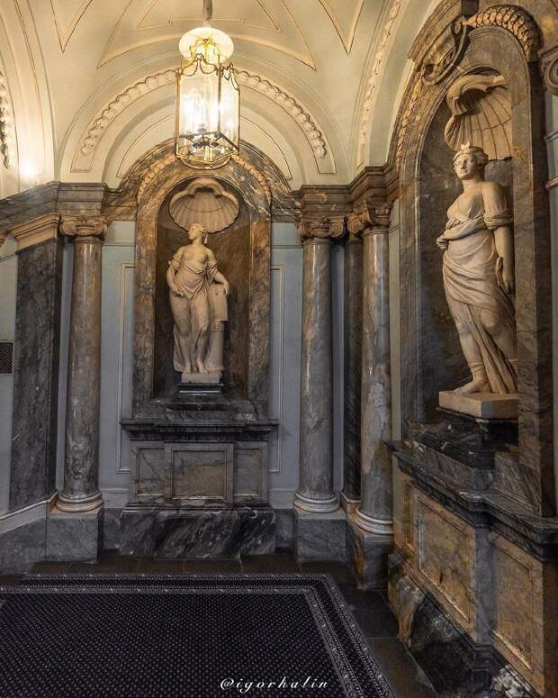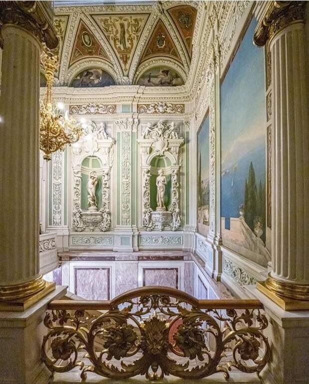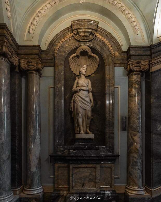 Парадная лестница в Мраморном дворцеЭта парадная лестница была задумана Екатериной II как лестница времени. Федор Шубин установил в мраморных нишах лестницы аллегорические скульптуры из каррарского мрамора, олицетворяющие время суток.
