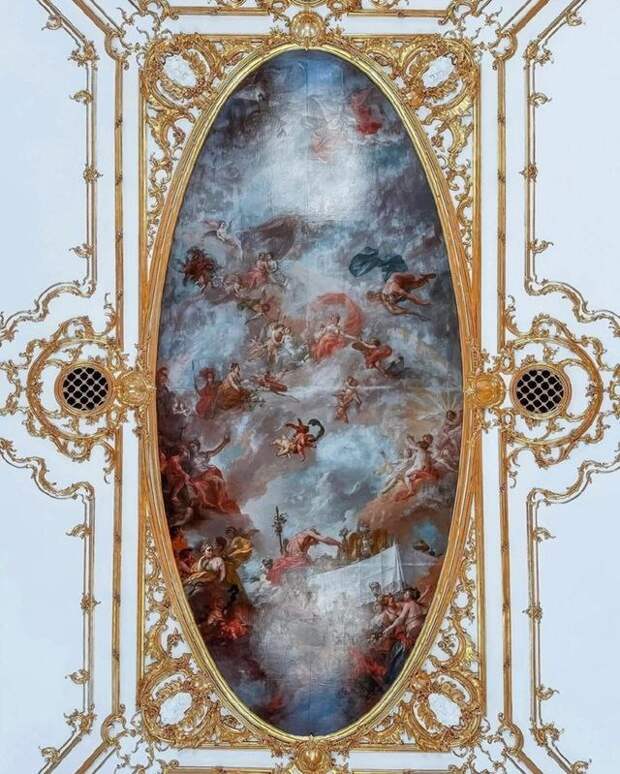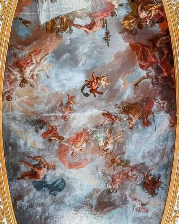 Изначально полотно украшало потолок Приемного зала. Но после реконструкции под руководством А.П. Брюллова плафон был перемещен на потолок Парадной лестницы.