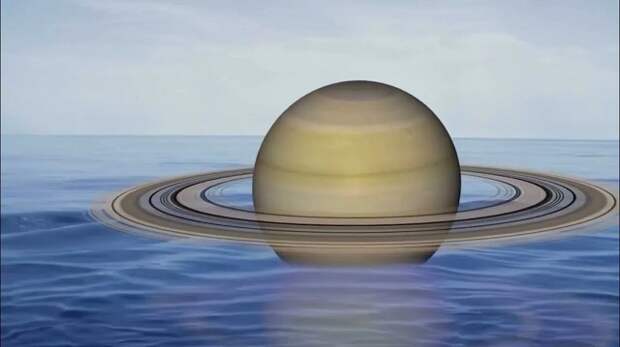 Плотность Сатурна почти в два раза меньше плотности воды. Выходит, если бы удалось найти столь огромный стакан с водой, то Сатурн плавал бы на его поверхности.
