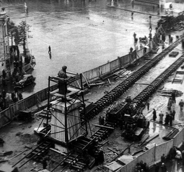 На этом снимке 1935 года запечатлен временный памятник, который был установлен на Манежной площади в честь выхода фильма братьев Васильевых: «Чапаев». Скульптура, на самом деле, не получила особо теплого отклика у москвичей. Образ самого Василия Ивановича москвичи вообще сравнивали со стариком Хоттабычем.