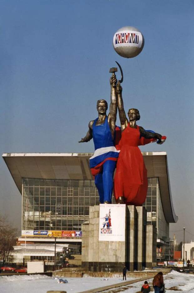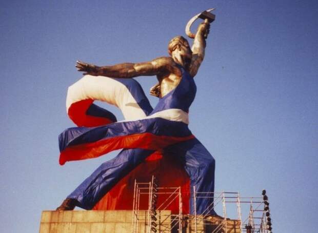 Активисты из текстильного объединения «Монолит» решили привлечь внимание к такому безобразному положению дел и одели монумент в цвета российского триколора. Рабочему — синий комбинезон, колхознице — красный сарафан.
