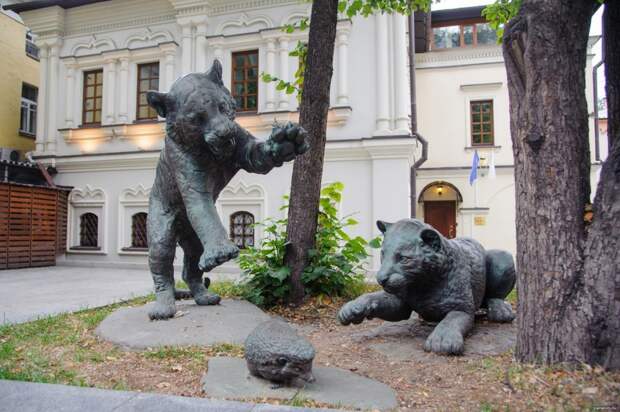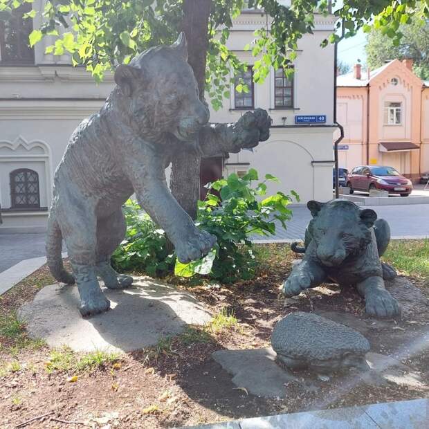 В Москве на улице Мясницкой есть забавный бронзовый памятник - два тигренка, играющих с ежом.