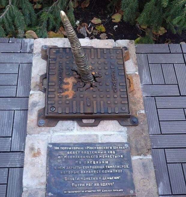 Этот странный памятник установили на Саввинской набережной в конце 2018 года. Скульптор Сергей Червонский изобразил рог единорога, пробивающий люк, под которым спрятан тайный ход из Новодевичьего монастыря.