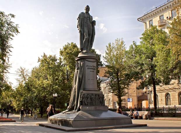 В 1958 году готовились отметить 130-летие гибели Грибоедова. Скульптор Аполлон Мануйлов и архитектор Александр Заварзин создали гипсовую модель высотой 8 м, протестировали её у МГАХИ в Товарищеском переулке . Бронзовую статую отливали в Ленинграде, и уже 27 июня 1959 года она заняла место на Чистопрудном бульваре — возле дома, где Грибоедов жил в 1823–24 годах (Мясницкая, 42)