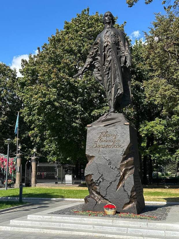 Увековечил образ в бронзе скульптор Николай Жуков. Высота скульптурной композиции вместе с постаментом составляет 8-метров. На постамент нанесены одни из самых известных стихотворных произведений Гавриила Державина: «На взятие Измаила», «Признание» и «Памятник».
