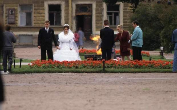 Жених и невеста у Вечного огня на Марсовом поле. Фотограф Всеволод Тарасевич. 1995 год. Источник