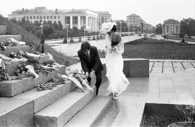 Молодожёны у Вечного огня. Фотограф Василий Евдокимов. Чебоксары. 1983 год. Источник