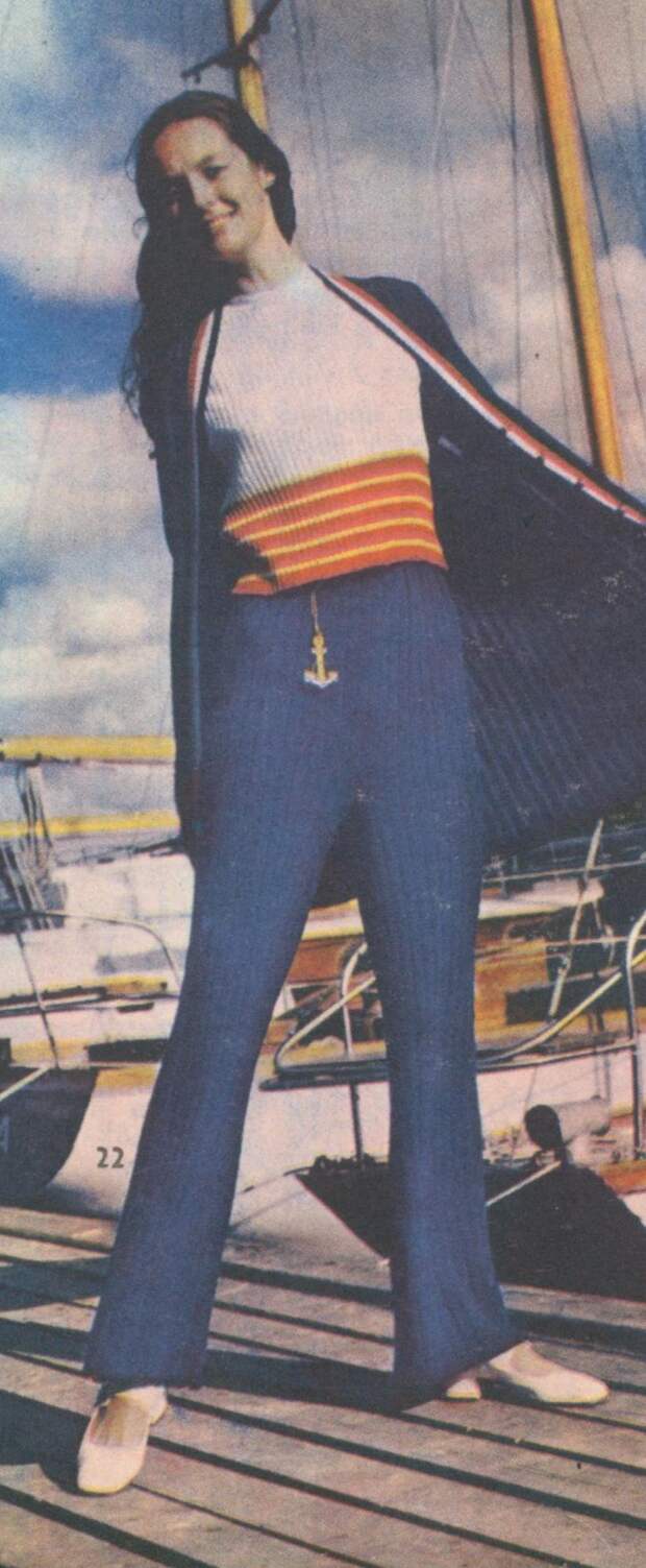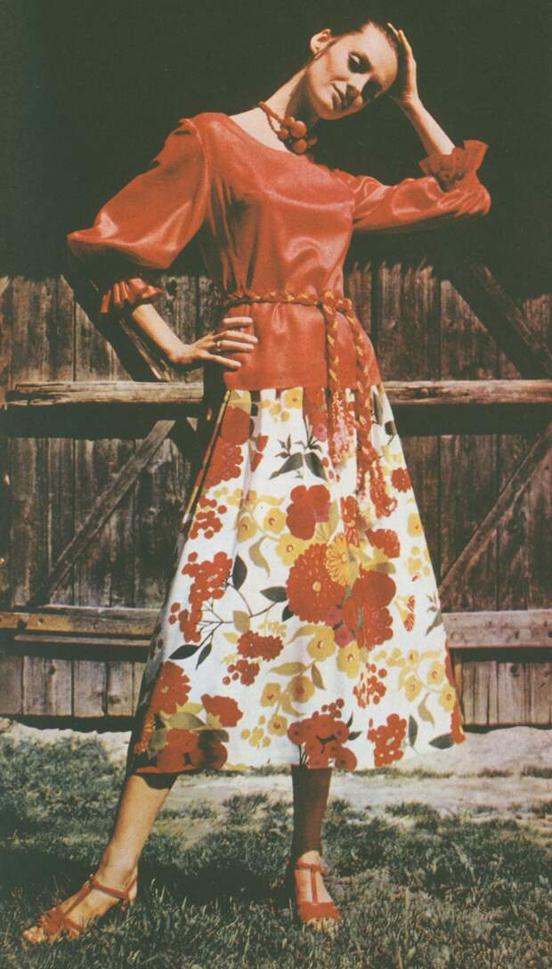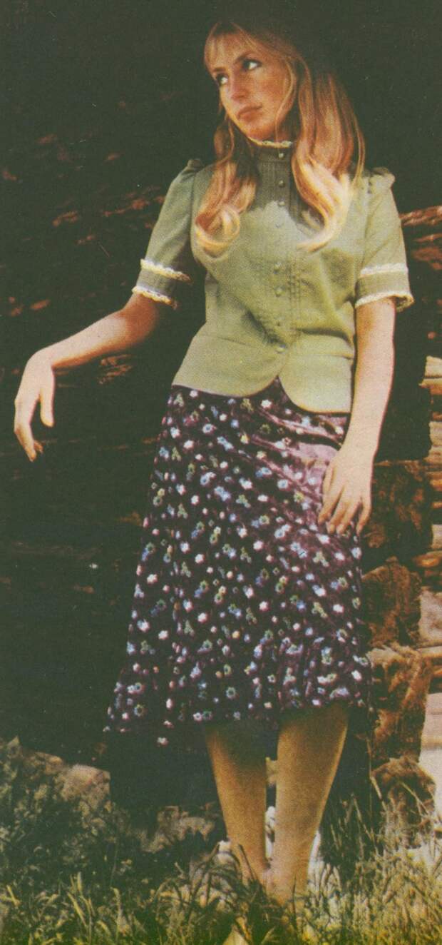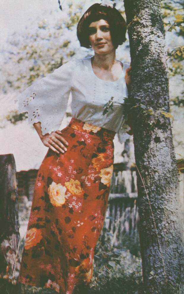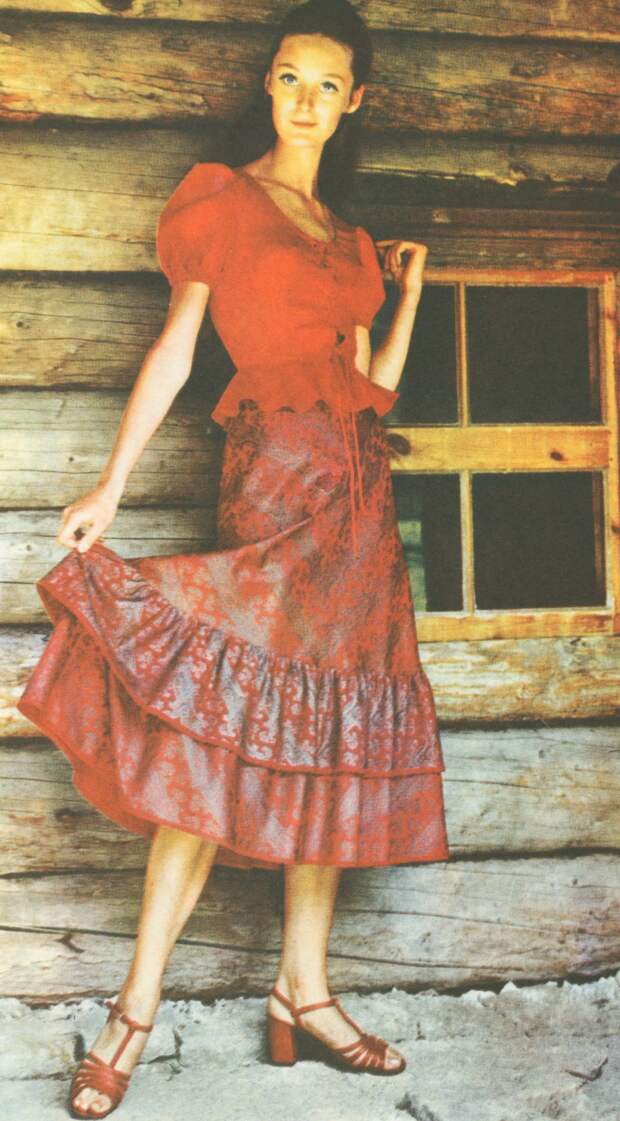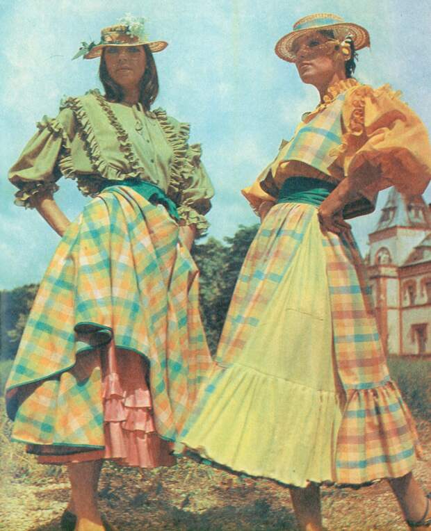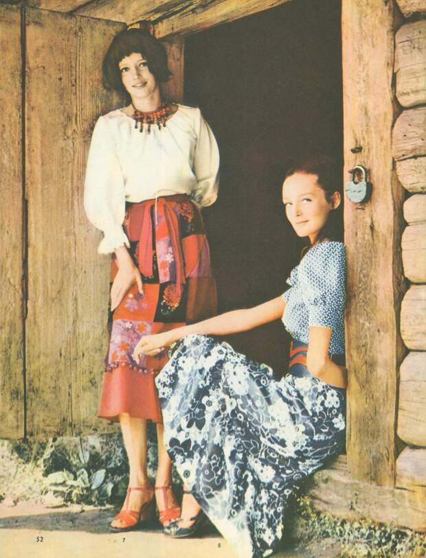 В 1970‑х миди и макси не менее популярны, чем мини: длина юбок достигает огромной вариативности. Особенно ценятся джинсовые модели, но это большая редкость. Орнаменты и вышивки «в цветочек» с элементами древнерусских узоров и традиционные фасоны были отголосками славянского стиля и нарядов хиппи, популярных в те годы. А ещё в моду вошли брючные костюмы и кепки с длинными козырьками — кепи.