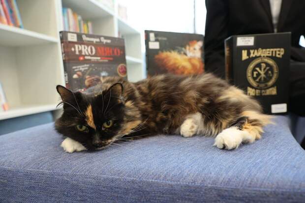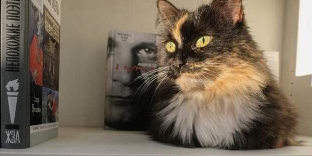 Милая хранительница знаний по имени Ефросинья (или просто Фрося) обитает в библиотеке им. В.В. Маяковского. Четвероногая работница любит сидеть на ручках и гулять по книжным полкам.