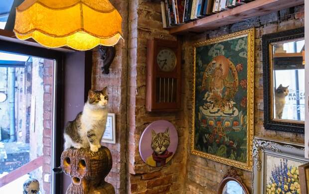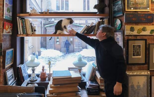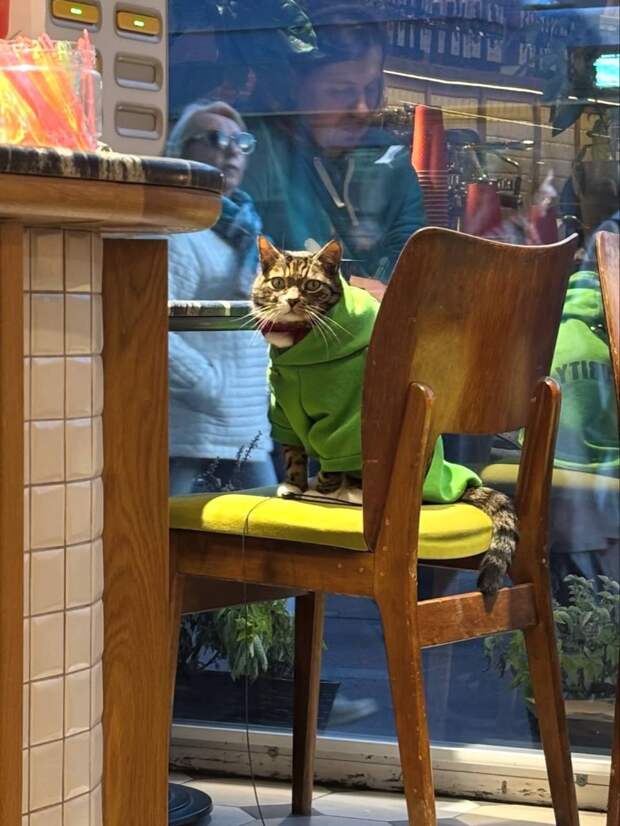 Котик в стильном худи живёт в книжном кафе в Петербурге
