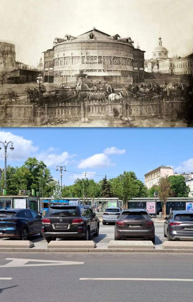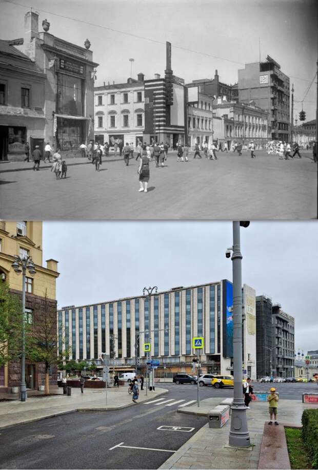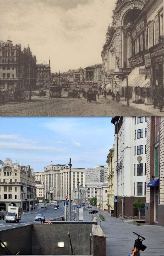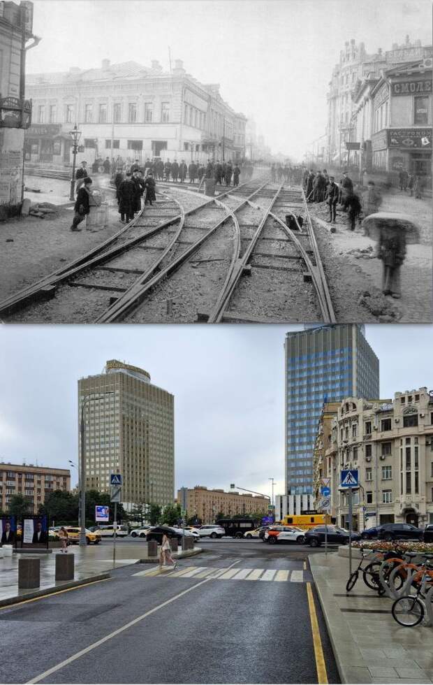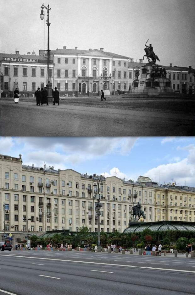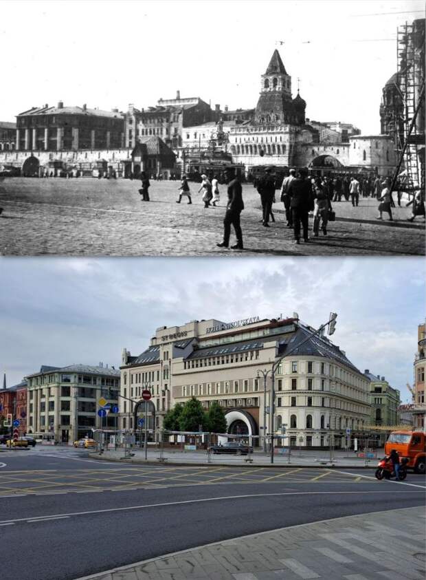 От старого пейзажа осталась только гостиница «Националь». На дальнем плане видна часовня во имя Святого благоверного князя Александра Невского. За часовней видна гостиница «Лоскутная», возведённая по проекту Александра Степановича Каминского. В советские годы здесь было общежитие для сотрудников ЦК ВКП(б). Здание было разобрано в 1938 году.