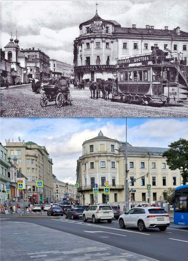 Вид на Маросейку от Ильинских ворот. Начало XX века. На первом плане пассажирский вагон с лошадьми и рекламой «Коньяк Шустова» — знаменитая московская конка. В 1909 году конку сменил электрический трамвай. Справа дом графини Варвары Петровны Разумовской, возведённый в 1796 году. На его первом этаже тогда работала Маросейская аптека, или магазин аптекарских товаров. Кстати, аптека в здании работает по сей день. Правда, под другим брендом.
