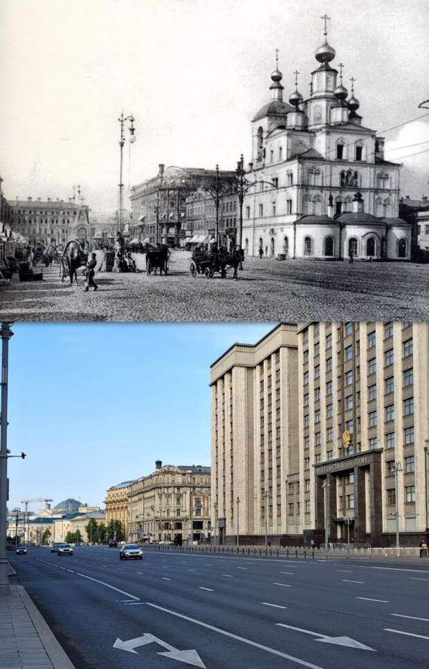 Охотный Ряд в начале XX века. Точную дату снимка определить трудно, но, судя по тому, что гостиница «Националь» (на дальнем плане) уже построена и открыта, не раньше 1902 года. По центру старинного кадра большой двухэтажный храм во имя Параскевы Пятницы, возведённый ещё князем Василием Васильевичем Голицыным в 1680-х годах.