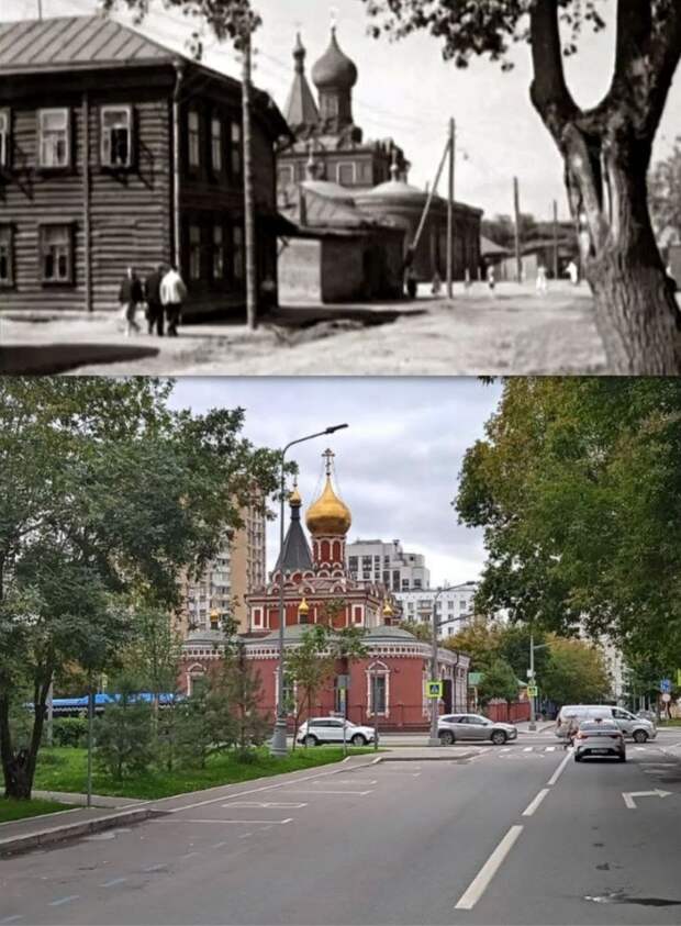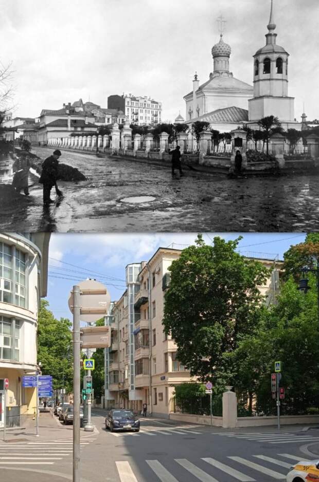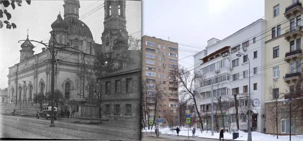 Слева храм Святителя Николая в Клинниках. В советские годы он был закрыт решением Моссовета; купол и маковка снесены; храм перешёл на баланс ЦК комсомола. С 1990 года здесь опять идут службы. Храм был воссоздан в прежнем облике.