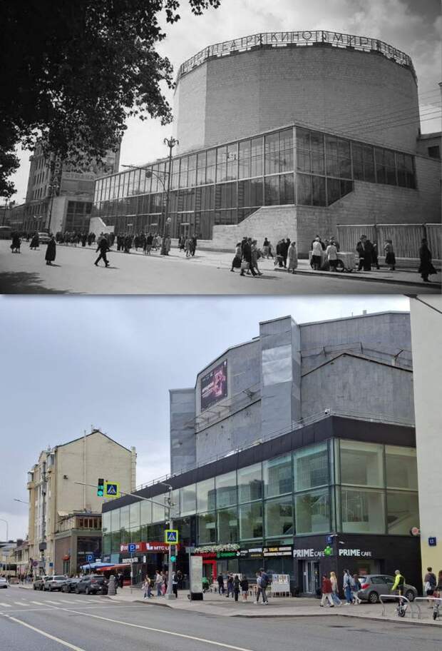 Цветной бульвар в 1958 году: только что построенный панорамный кинотеатр «Мир». В его основе — старинный восьмигранный манеж, возведённый в 1881 году для выставки-панорамы «Штурм Плевны». В 1886 году здесь открылся цирк братьев Никитиных, что вызвало недовольство у Альберта Вильгельмовича Саламонского, владельца соседнего цирка. Он выкупил манеж, заставив братьев покинуть Москву, хотя они вскоре вернулись. До советских лет на фасаде красовалась надпись «Манеж Саламонского». Некоторое время там демонстрировалась панорама «Иерусалим во время распятия».