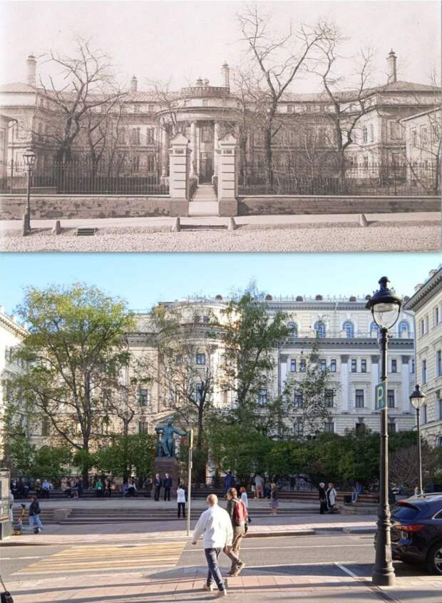 В основе здания дворец генерал-поручика Александра Матвеевича Хераскова, служившего в эпоху императрицы Екатерины II президентом Ревизион-коллегии. Дворец стоял между Тверской и Козьим болотом; позади - парк с тремя прудами. Ничего из этого не сохранилось.