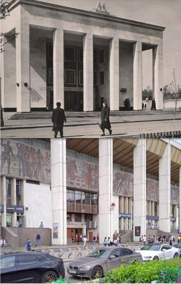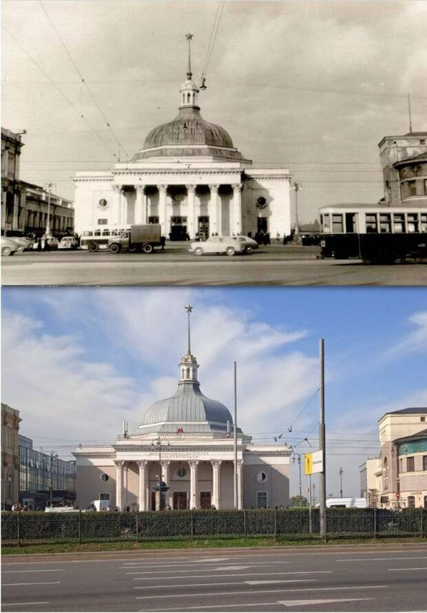 На чёрно-белом кадре слева виден маленький павильон станции метро «Смоленская». Станция появилась в составе первой очереди в 1935 году. В 1953-м участок мелкого заложения от «Калининской» (ныне «Александровский сад») до «Киевской» был закрыт. Ставший ненужным павильон снесён примерно через год. Станция была повторно открыта в 1958 году в составе Филёвской линии. Подземная галерея станции со временем обернулась подземным пешеходным переходом.