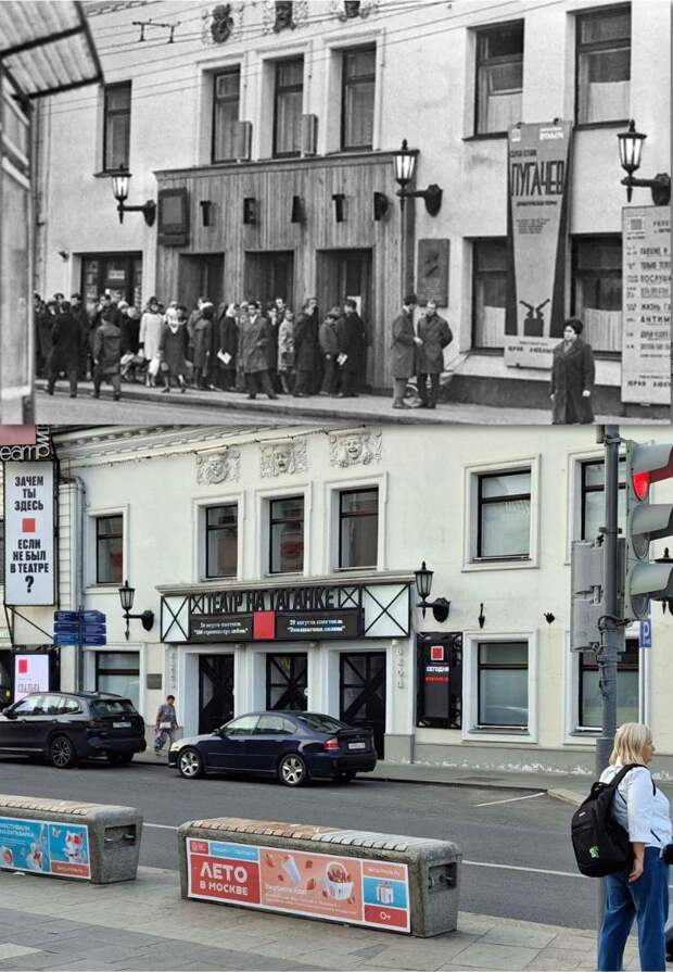 Афиша возвещает о грядущей премьере спектакля «Пугачев» по мотивам поэмы Сергея Есенина. Премьера состоялась 17 ноября 1967 года. Театр был создан за три года до этого, в апреле 1964 года. Популярность была запредельной. Достать билеты на спектакли было невероятно сложно. В «Пугачёве» роль Хлопуши исполнял Высоцкий. Публика шла посмотреть на него.