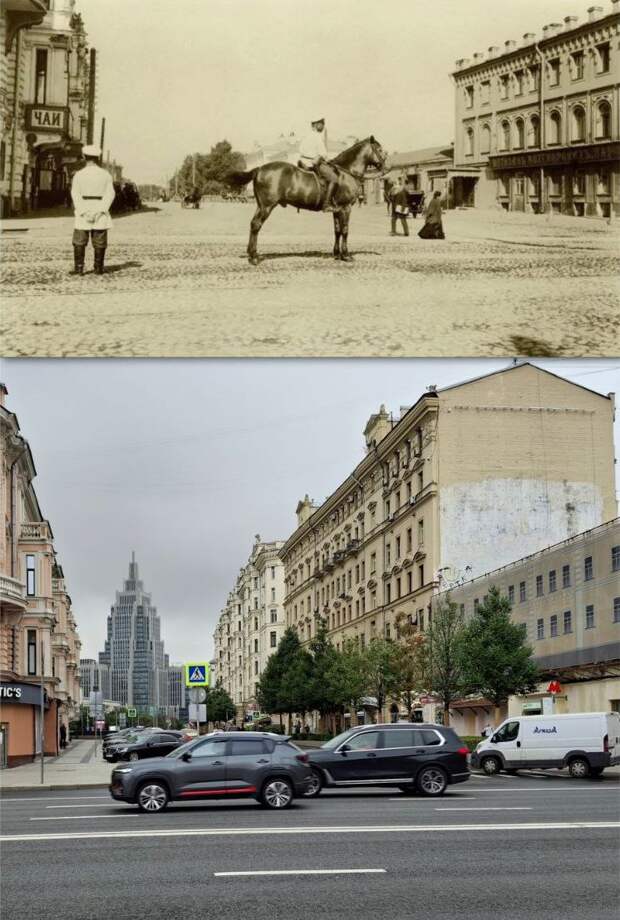 Слева в кадр едва попадает доходный дом Ивана Васильевича и Степана Васильевича Хомяковых. Под ним в конце 1950-х был проложен Маяковский тоннель. Справа еще один доходный дом, где в 1860-е жил великий русский художник Василий Григорьевич Перов. В советские годы в дом был встроен вестибюль станции метро «Маяковская». Дом Перова планировали снести в наше время, но потом от этих планов отказались. Вот уже 10 лет он затянут в строительный саван и ждёт реставрации.