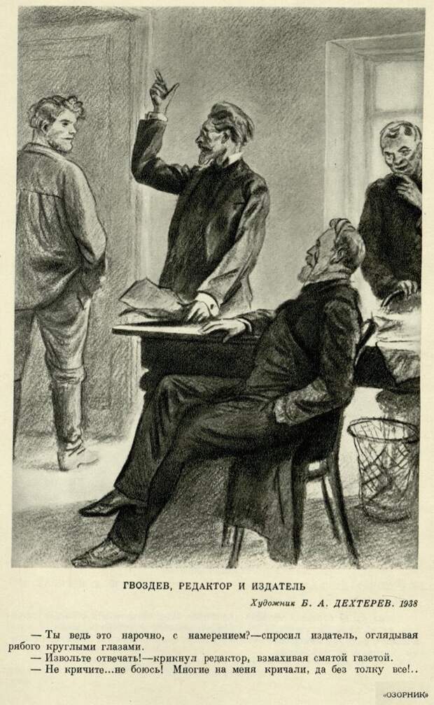 Редакция сочла необходимым сопроводить большинство иллюстраций соответствующими аннотациями—выдержками из произведений писателя, чтобы помочь зрителю воспроизвести в памяти тот момент в рассказе пли повести, к которому относится рисунок, а приводя характеристику, данную самим писателем известному персонажу или событию, предоставить тем самым возможность зрителю оценить ту силу образного воплощения идеи писателя, которой достиг художник.