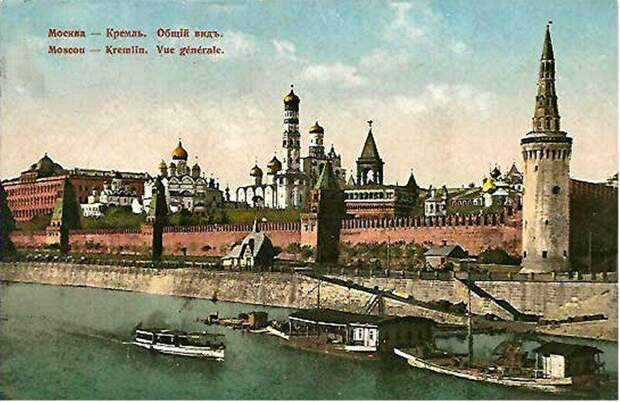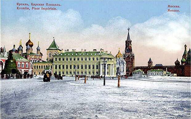 На первом плане Николаевский дворец, Дальше Вознесенский монастырь и узнаваемая Спасская башня. В правой стороне кадра строительная площадка, идут работы по сооружению памятника-мемориала Александру Второму.