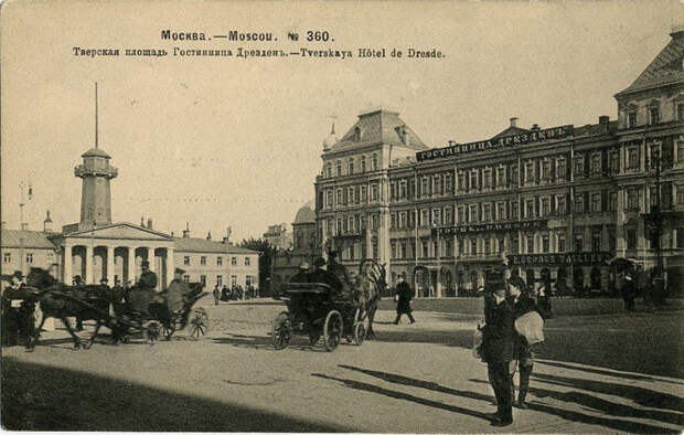 Фотомомент из истории города: Тверская площадь в начале ХХ векаВ левой части снимка можно заметить дом с каланчой, в котором располагалось полицейское управление и пожарная часть. Здание снесли в 1923 году. Сейчас на его месте располагается сквер с памятником Юрию Долгорукому.