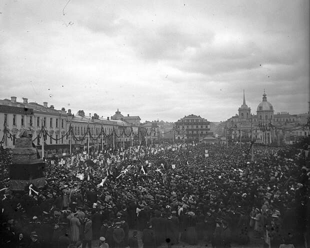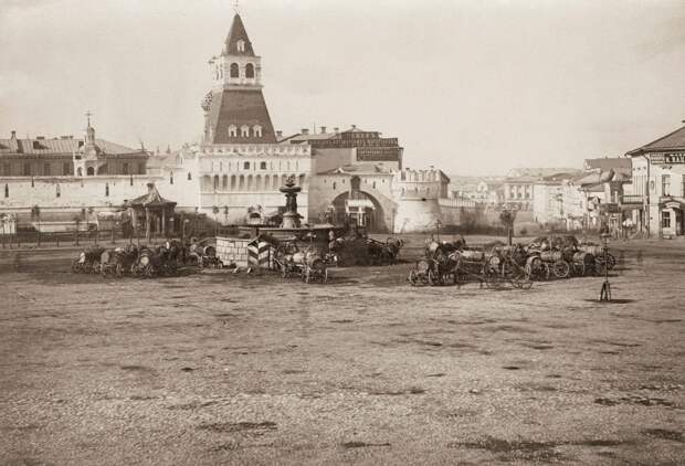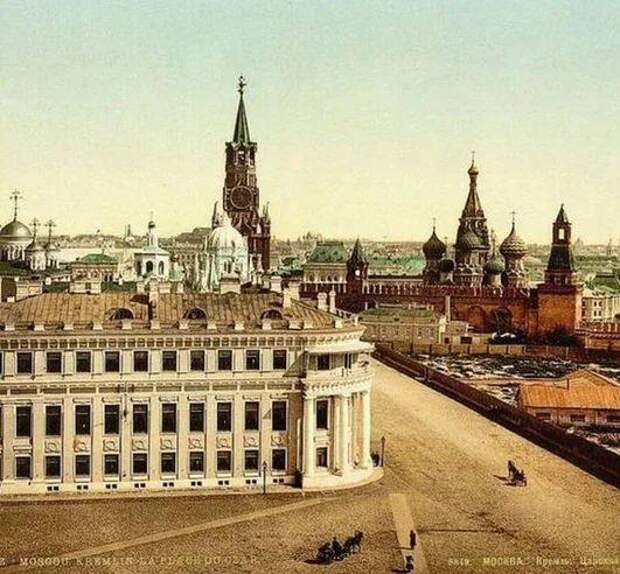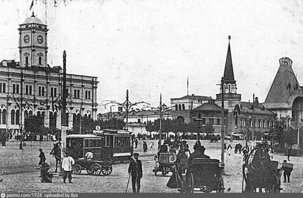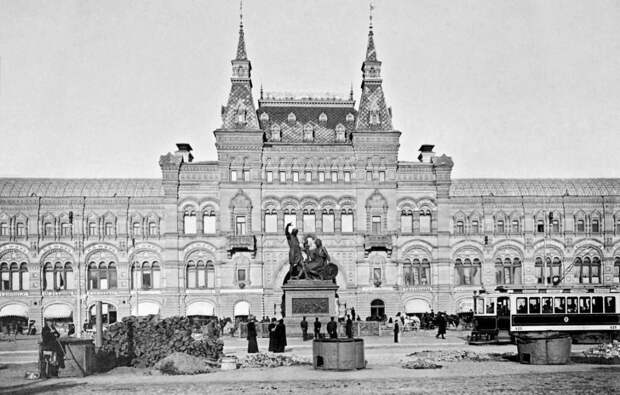 Так в 1910 году в Москве выглядело пространство перед ГУМом (тогда это были Верхние торговые ряды).Памятник Минину и Пожарскому тогда стоял там, а не у Собора Василия Блаженного.
