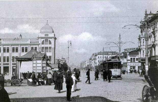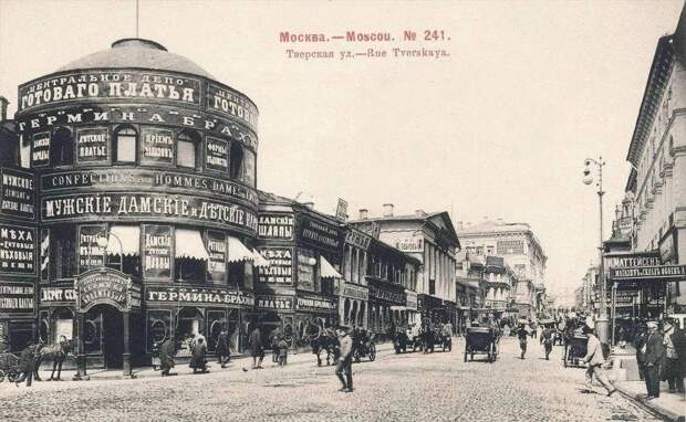 Тверская, угол с Б Садовой. На заднем плане магазин Болдакова, где продавались ткани и галантерея. Сейчас на этом месте вход на станцию метро Маяковская, 1907