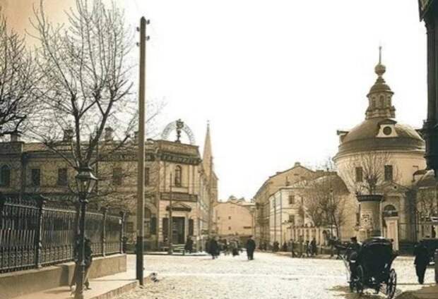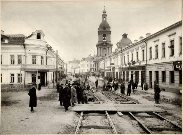 Укладка трамвайных путей на Яузской улицеСейчас это место изменилось до неузнаваемости: осталась лишь Троицкая церковь с колокольней, слева находится Устьинский сквер, а дома по правую руку теперь совершенно другие. 1905 год