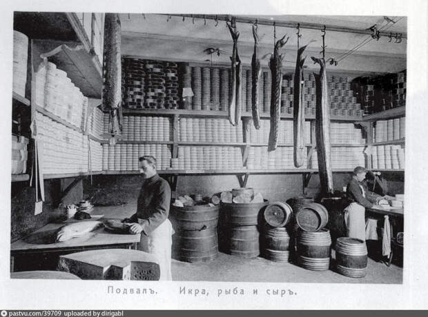 Подвал Елисеевского магазина, 1901 год. «Елисеевский» — магазин-гастроном в Москве в историческом здании на углу Тверской улицы и Козицкого переулка. Открыт купцом Григорием Елисеевым в 1901 году, сразу же стал центром общественного внимания за роскошные интерьеры, экзотические продовольственные товары и редкие вина.