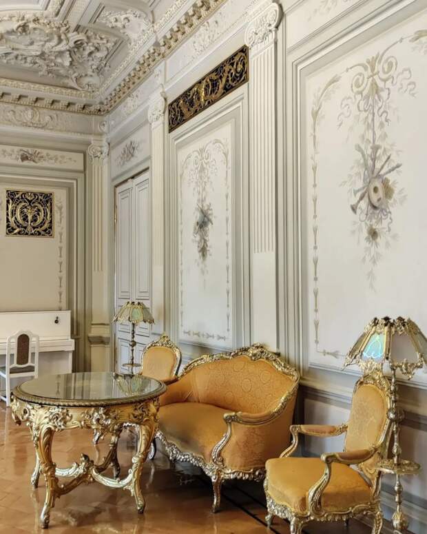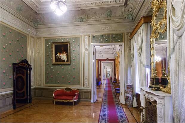 Во дворце всегда было веселье, гулянки и балы. Первый деревянный дворец сгорел в 1737г. Через два года отстроили новый одноэтажный. Интерьеры не сохранились, но известно, что выполнены они были в японском и китайских стилях. Архитектор Растрелли обустроил парк (карусели, пруд).