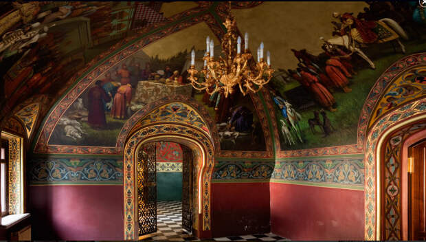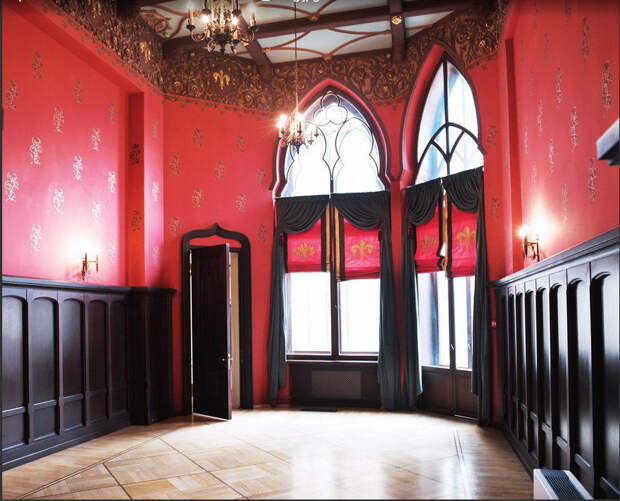 на 1-м этаже — вестибюль, холл (сени), Красный зал, Охотничий зал;