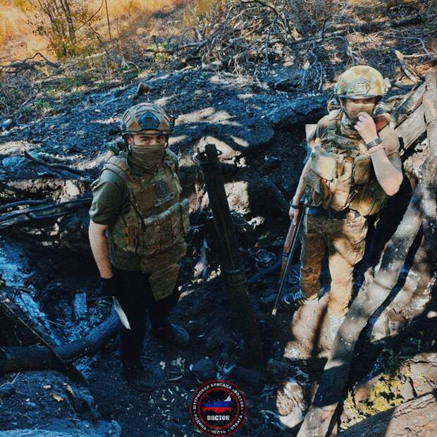 Наши бойцы Близнец и Бэра на ложной минометной позиции.Точка была сожжена атакой противника, а значит замысел обхитрить удался. Настоящая позиция и орудие остались невредимыми.