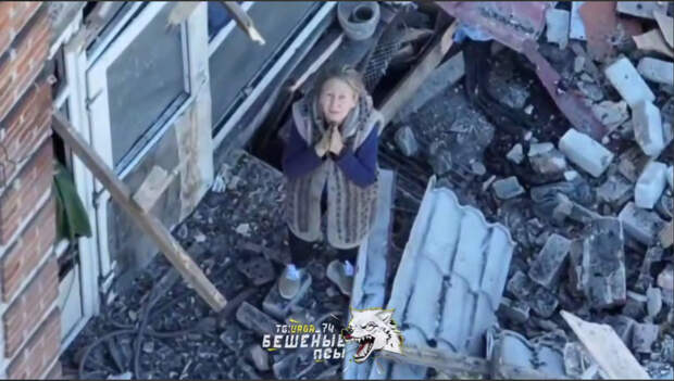 На звук винтов из подвала разрушенного дома осторожно выходит женщина. Она отказалась покидать свой дом и всё это время ждала прихода русской армии.