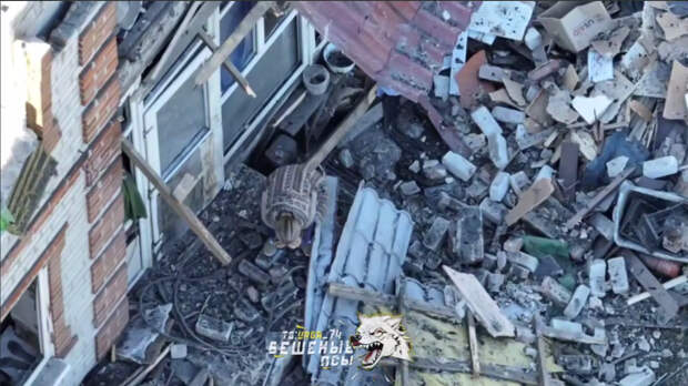 Дрон осуществляет облёт посёлка, освобождённого после ночного штурма, проверяя территорию на наличие скрывающегося противника.