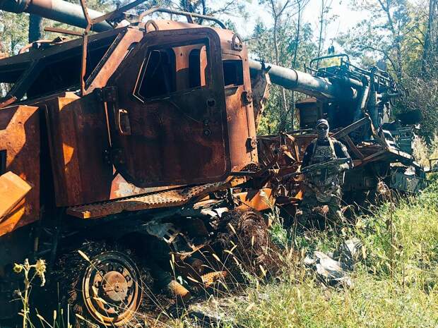 Бойцы ВС РФ возле сгоревшей 155-мм самоходной гаубицы 2С22 «Богдана» на шасси Tatra Phoenix ВСУ.